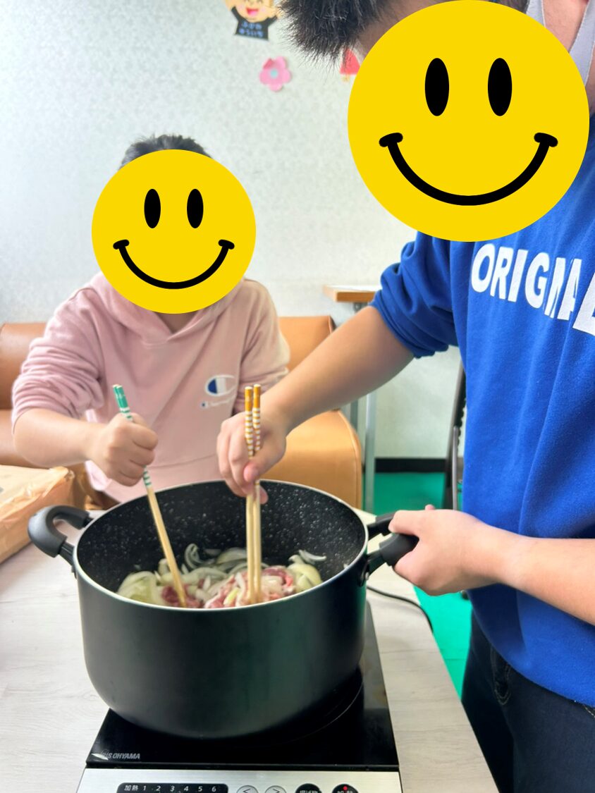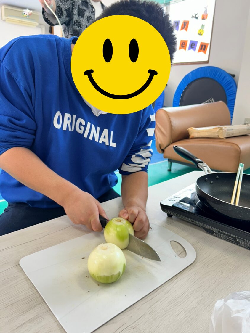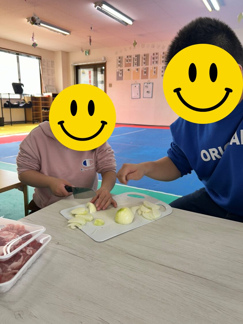 無事にお買い物を済ました後は、実際に調理です!事前に調理工程を調べてあったこともあり、スタッフの指示なしで調理用具を出したり、玉ねぎを切ったりと、協力して進めます!