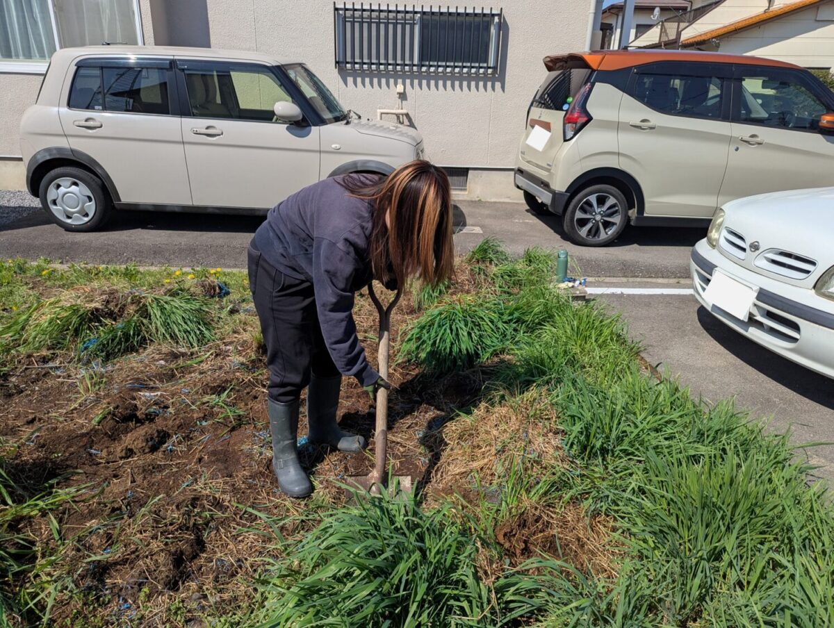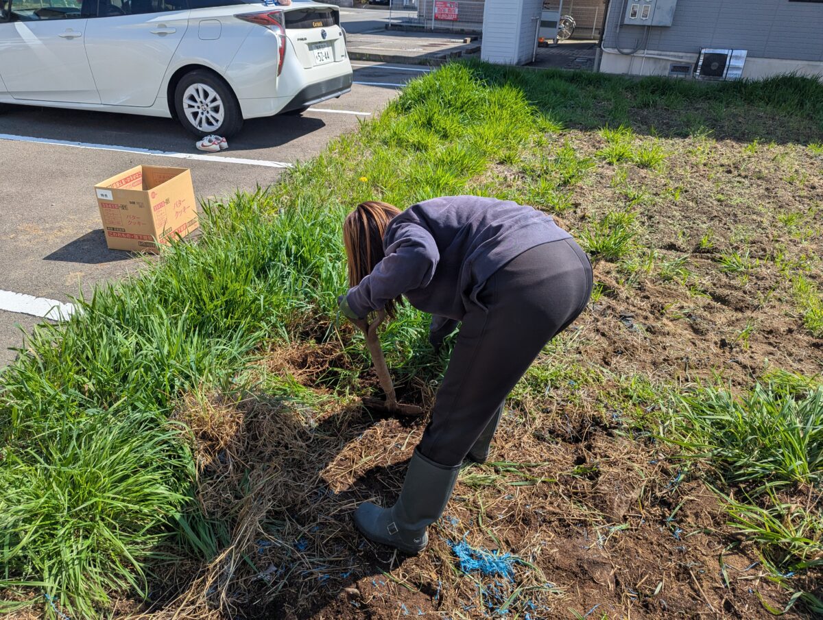 草刈りというか、草掘りというか、とにかく根っこがすごいのでスコップで掘り起こし作業。