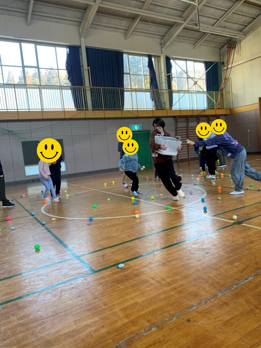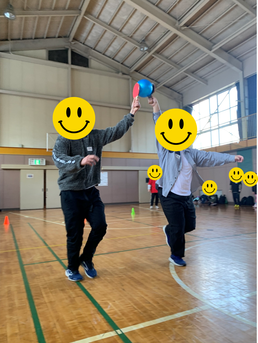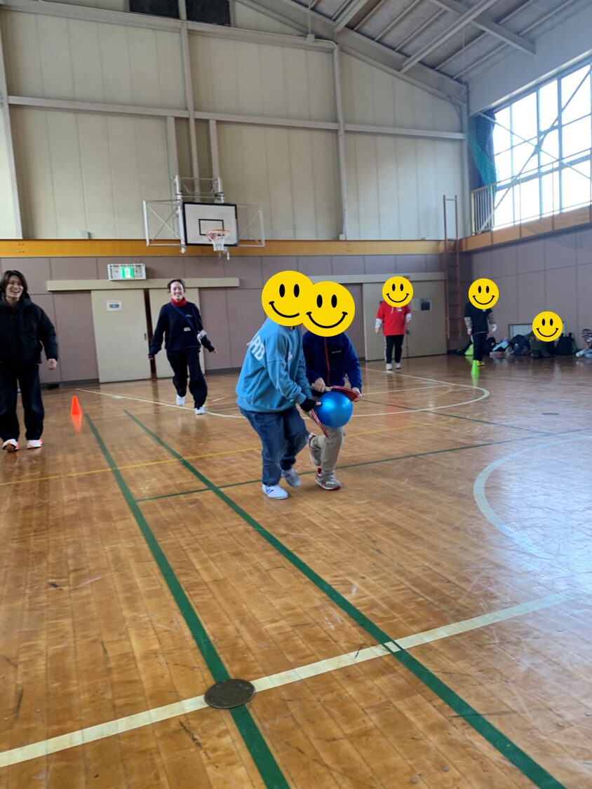2人で卓球ラケットにボールを挟みながら走って、早くゴールしたチームの勝ち!意外とボールを挟みながら走るのが難しく、大苦戦のこどもプラス💦山﨑も塩沢先生とペアを組み全力で走りましたが、きゃらめるびぃとさんの名物夫婦に惜しくも敗退、、!悔しいので次回リベンジお願いします!!(笑)