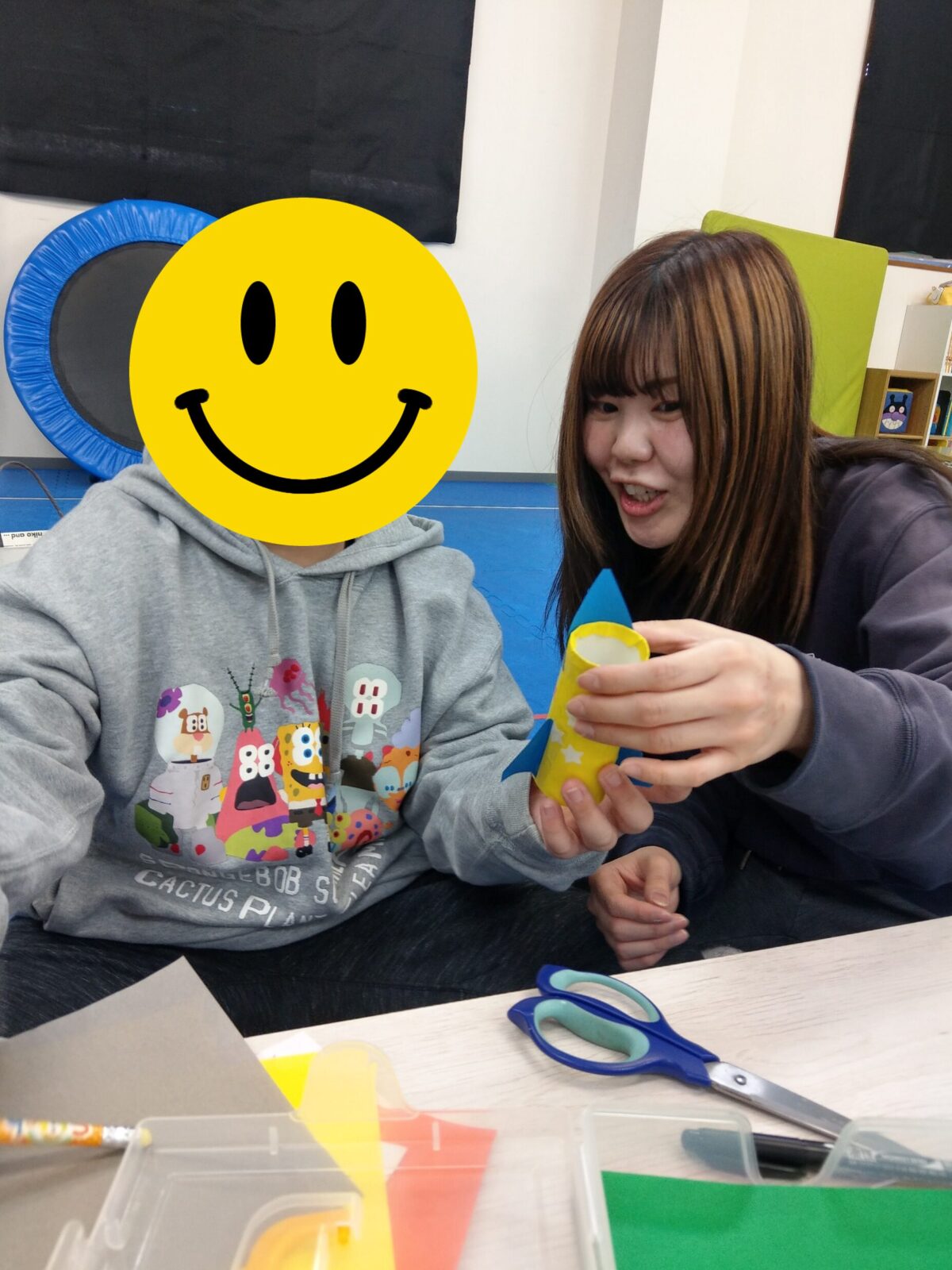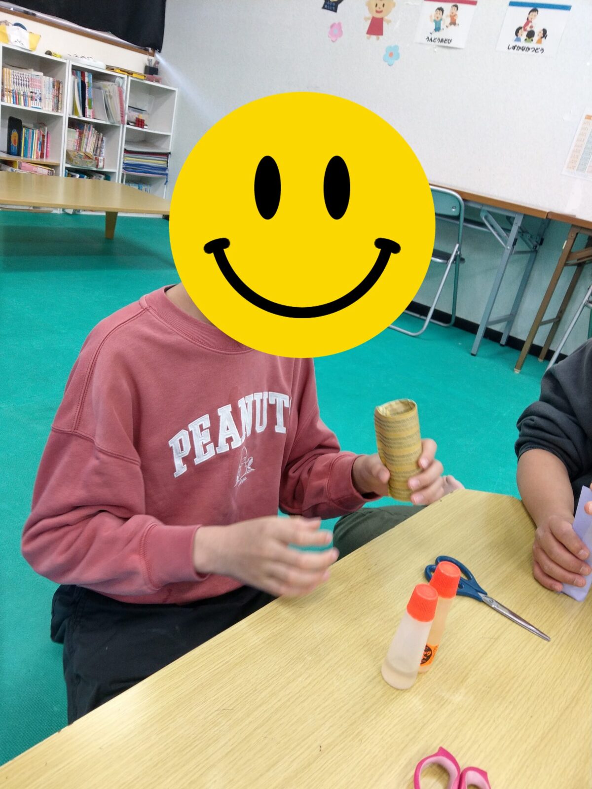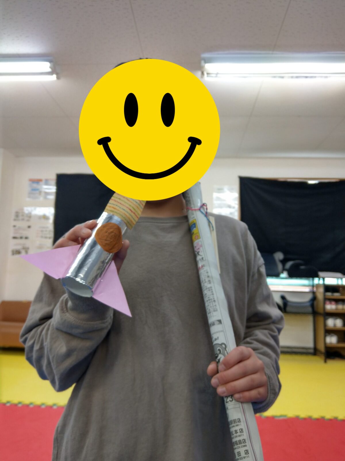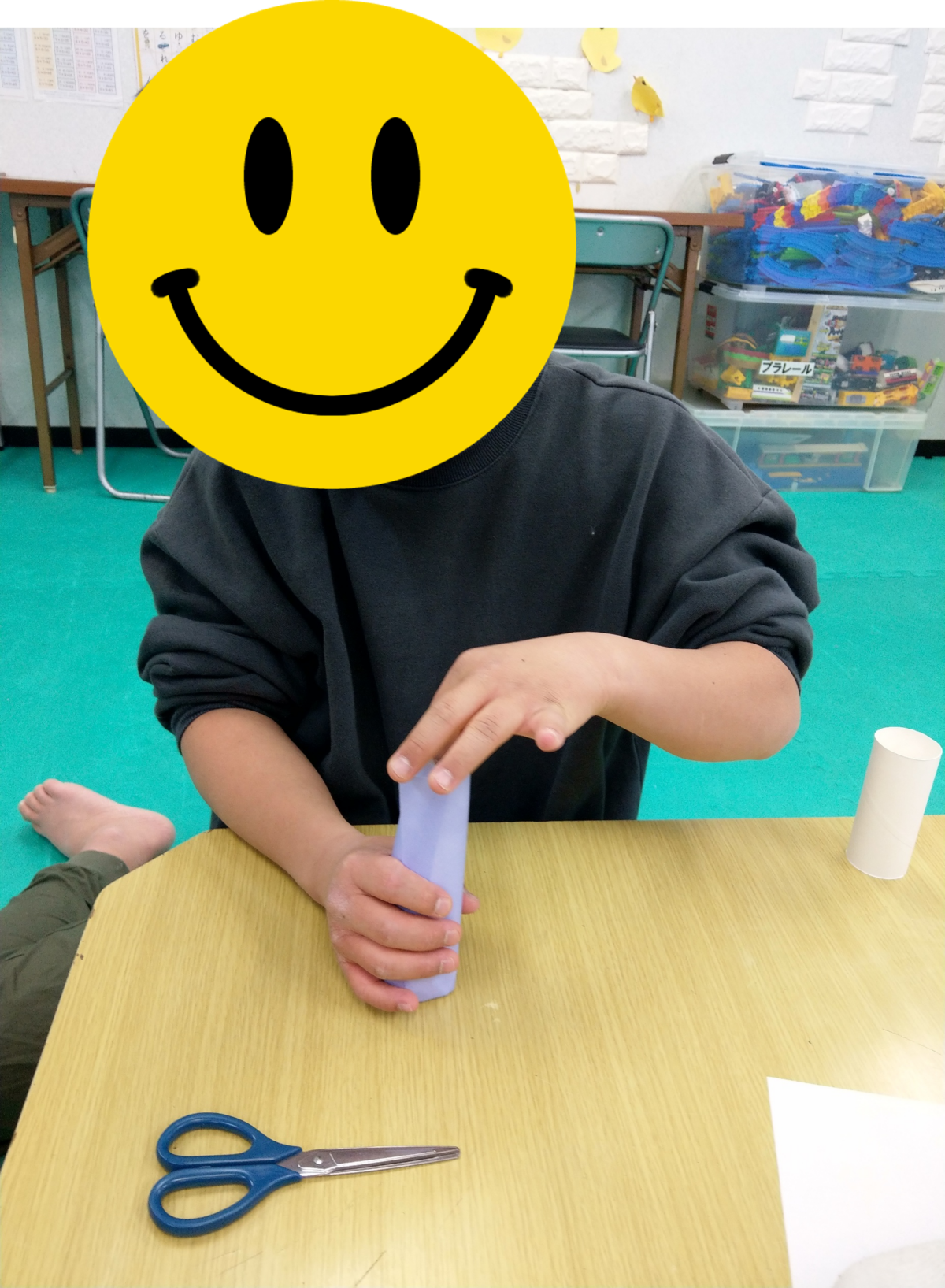今日の最初の活動は工作です。新聞紙、トイレットペーパーの芯を使ってロケットを作りました🚀